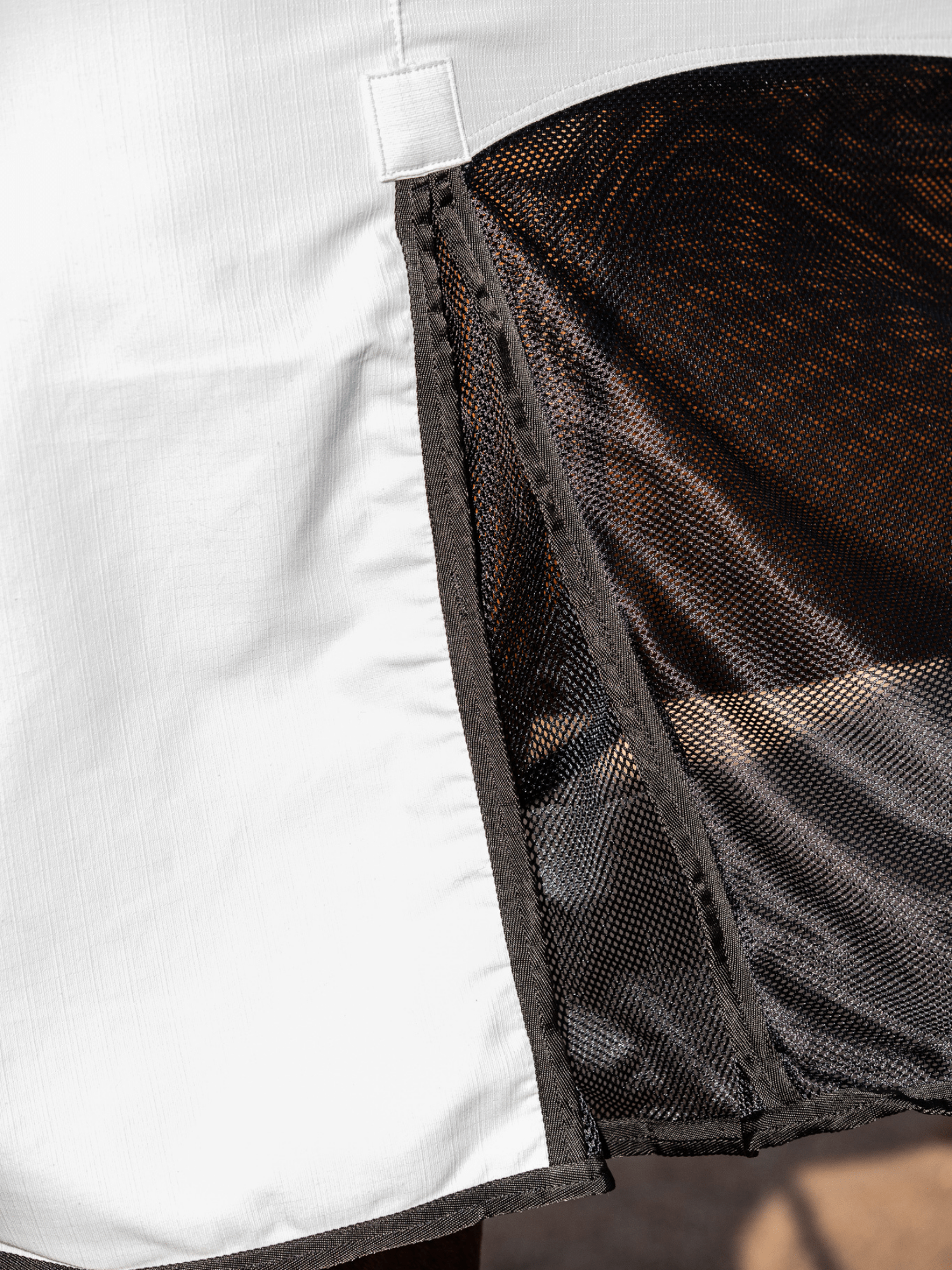 Tough but cool, white or oatmeal ripstop fabric, teamed with black mesh to show the dirt less.