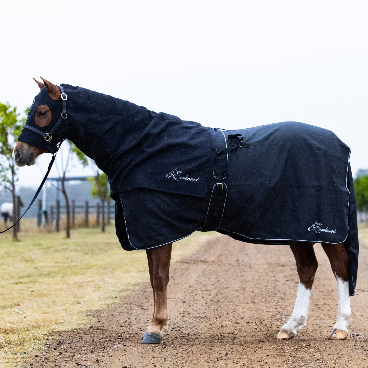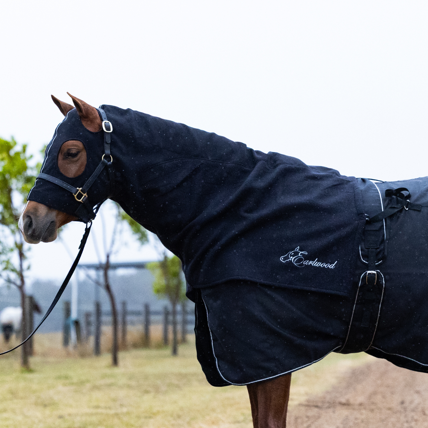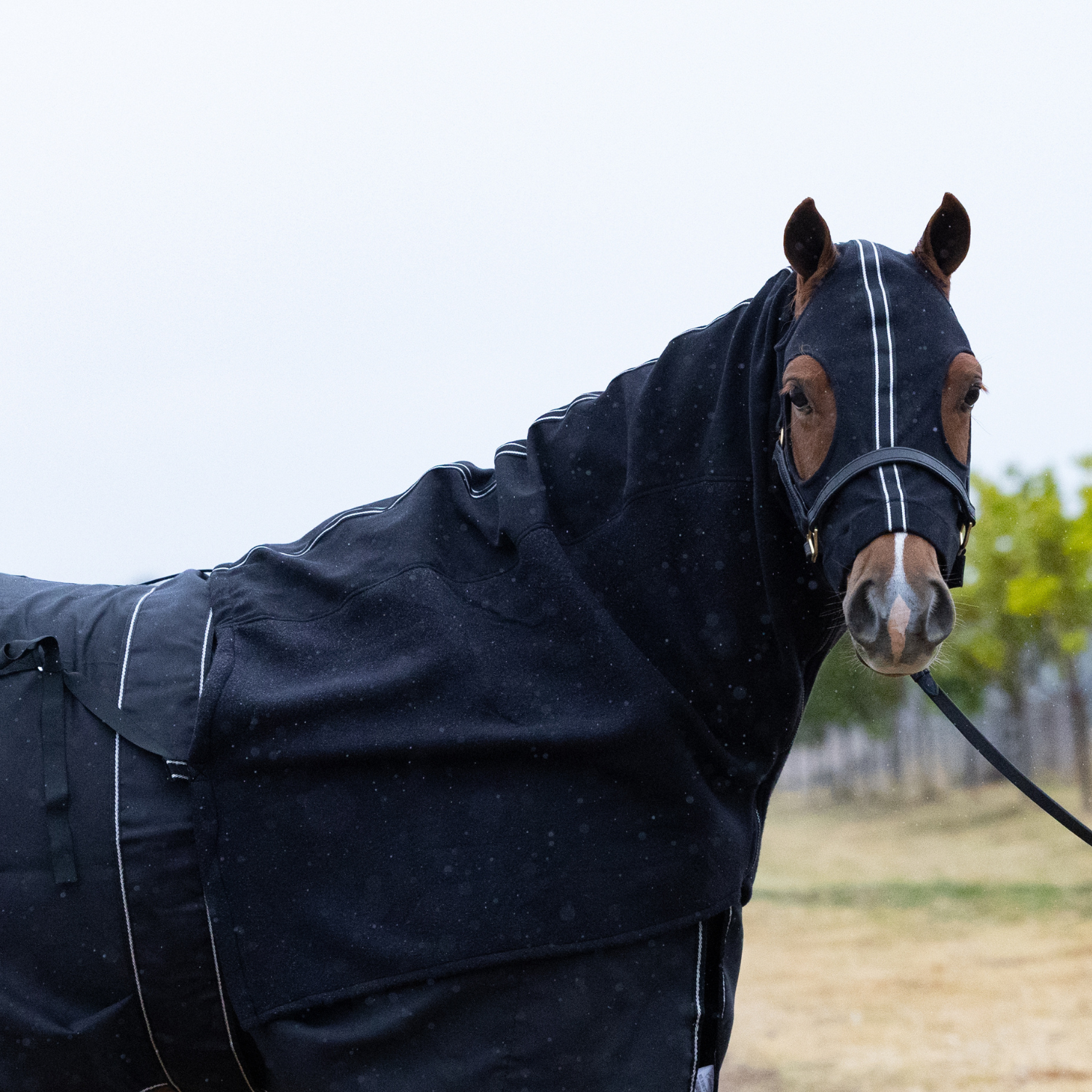 OUR POINT OF DIFFERENCE? Overheating can lead to mane loss, hence we have developed this hood to protect the mane, yet keep the neck warm at the same time. This new style hood has the same 95% stretch cotton fabric over the face and the top of the mane, to maintain that perfect fit and breathability, yet the warmth of 340gsm fleece along the neck panels to keep your horse cosy this Winter.