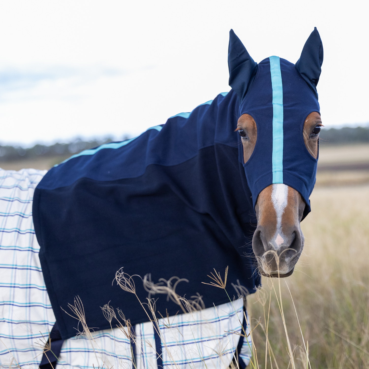 OUR POINT OF DIFFERENCE? Overheating can lead to mane loss, hence we have developed this hood to protect the mane, yet keep the neck warm at the same time. This new style hood has the same 95% stretch cotton fabric over the face and the top of the mane, to maintain that perfect fit and breathability, yet the warmth of 340gsm fleece along the neck panels to keep your horse cosy this Winter.