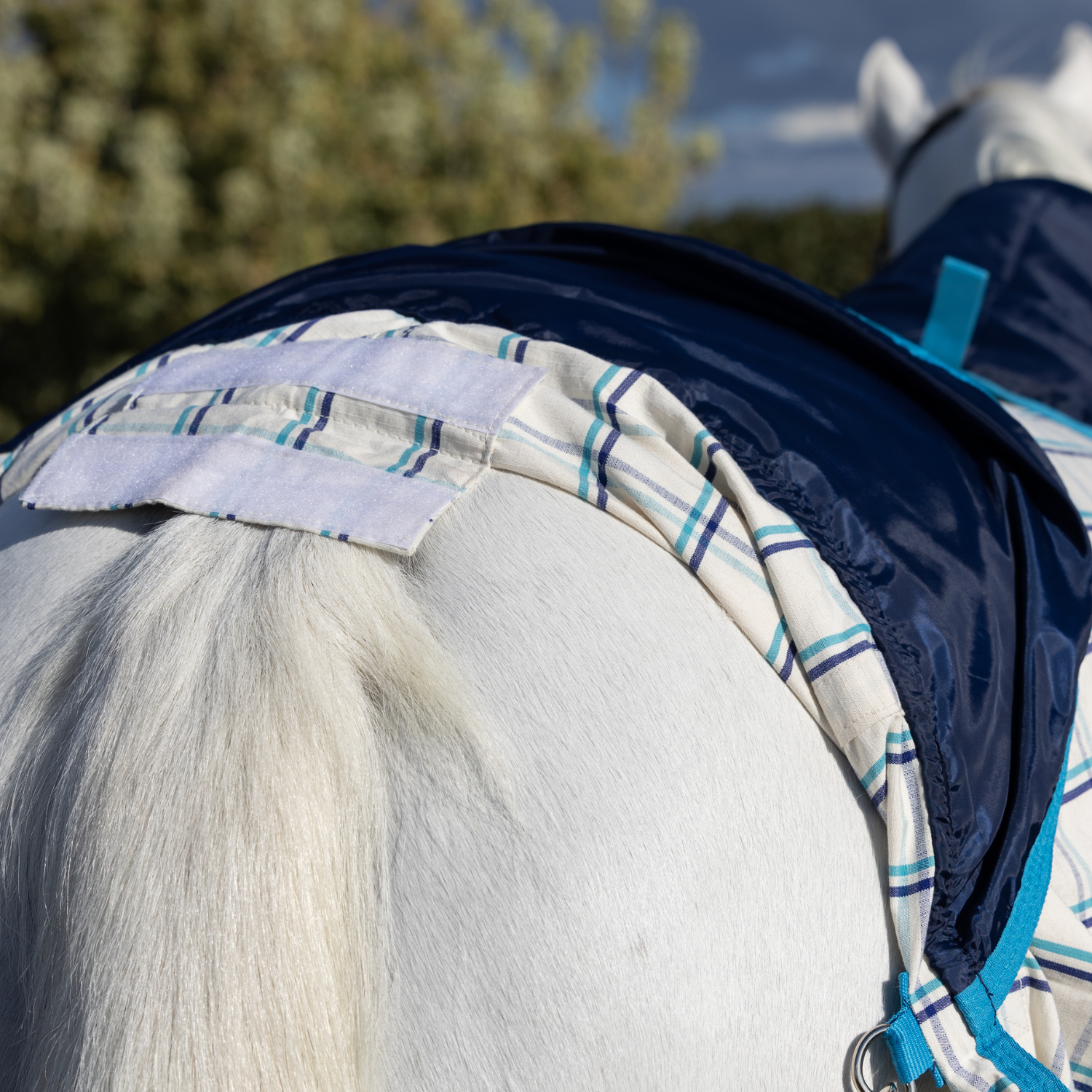 This rug has satin lined shoulders, neck section and tail flap. (Tail bag attachment already stitched on. *Tail bags sold separately.) Roomy neck rug with 3 strong plastic clips for quick rugging.