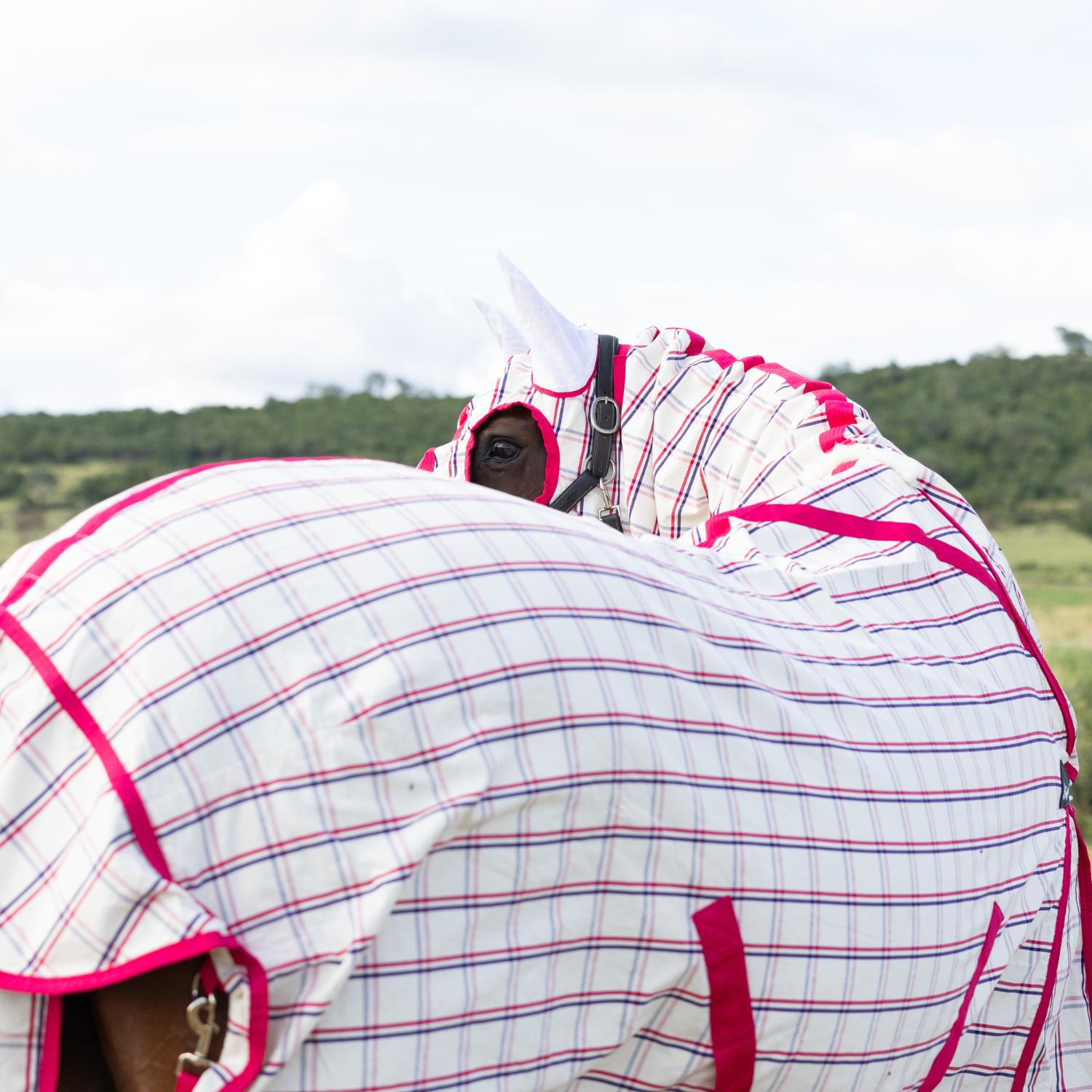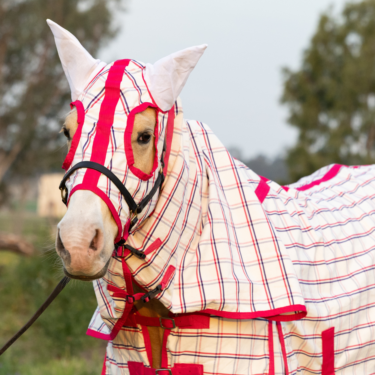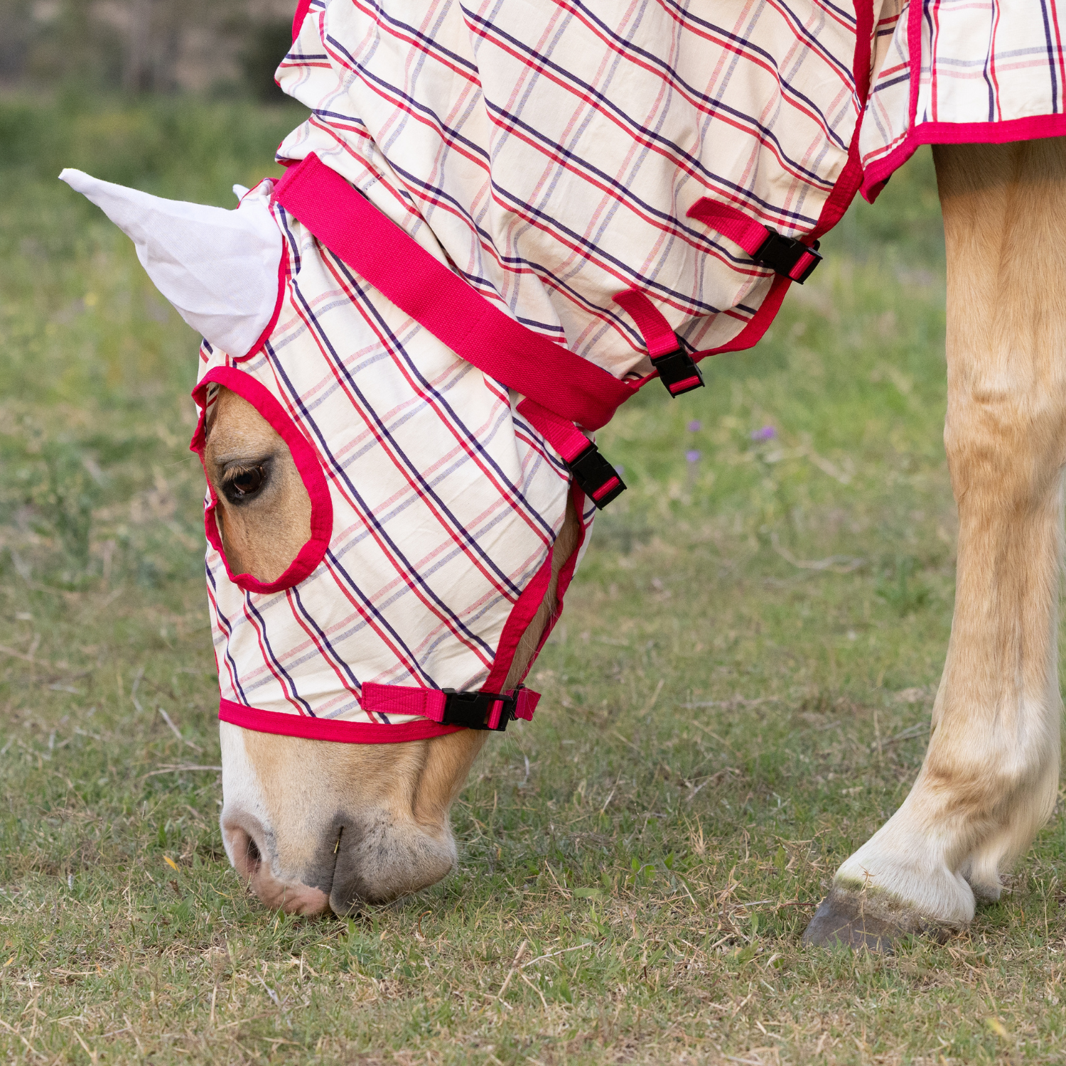 The hood has now been redesigned, with larger, safer eye holes, whether your horse's head is up or down. Flag fabric ears instead of ripstop provide extra breathability. There are 4 strong plastic clips that do up the head/neck piece for easy rugging, and a velcro safety strap for added security of the hood.