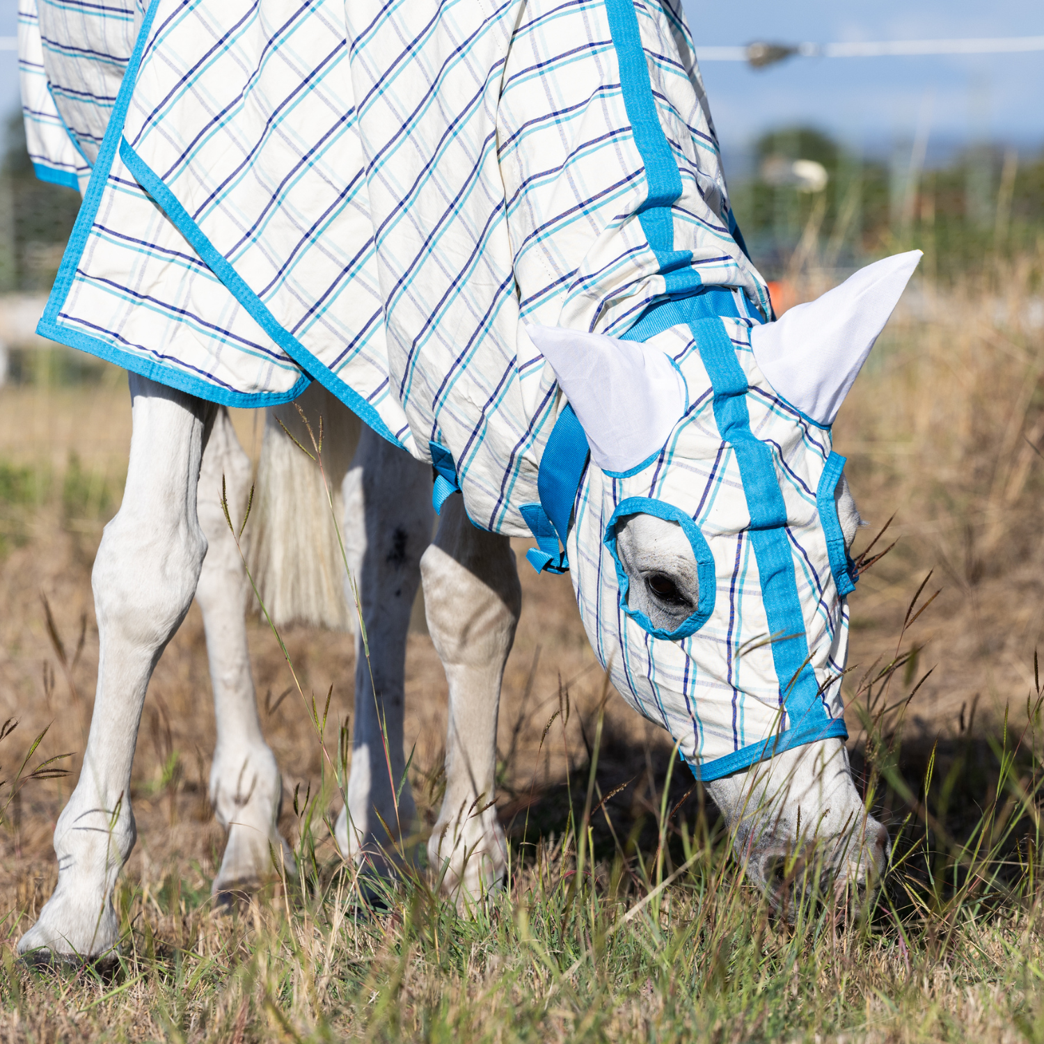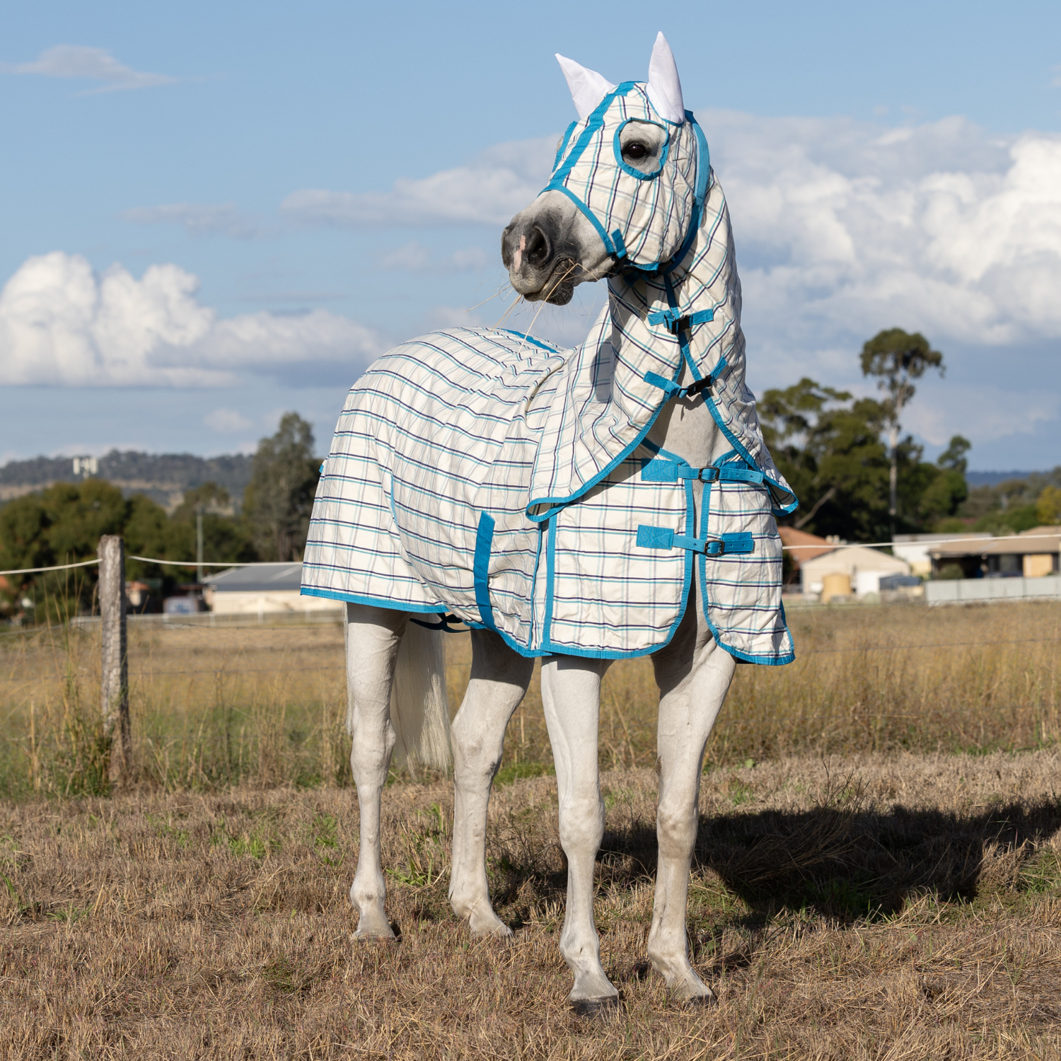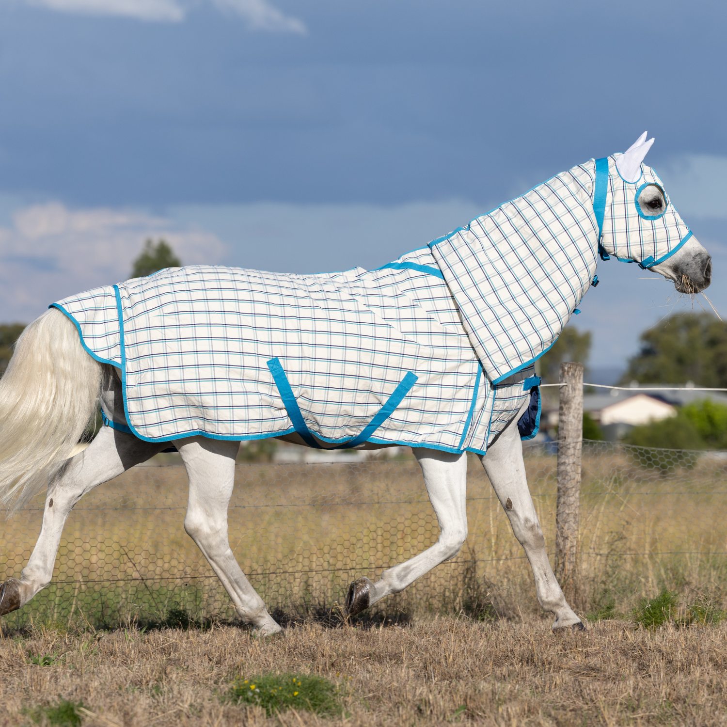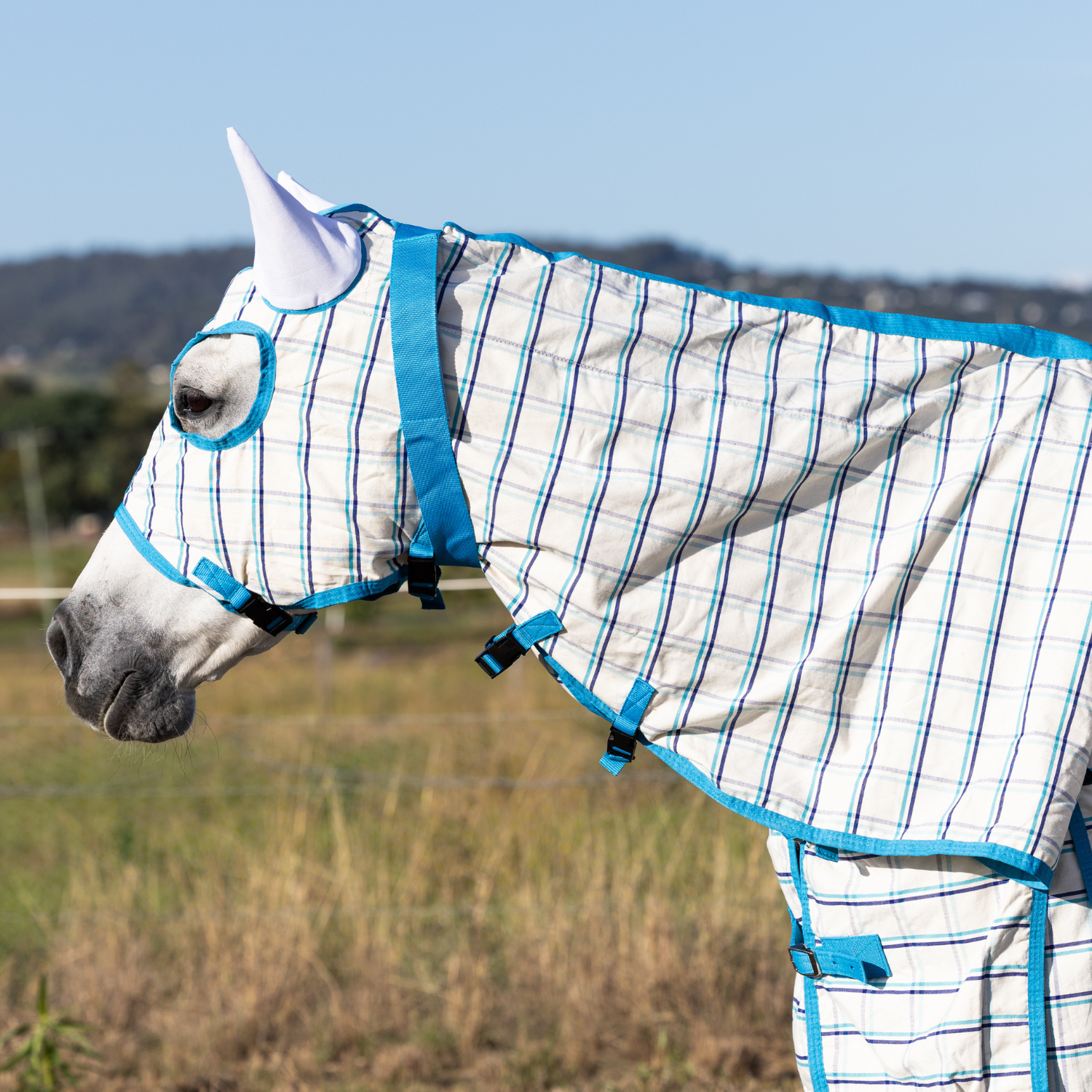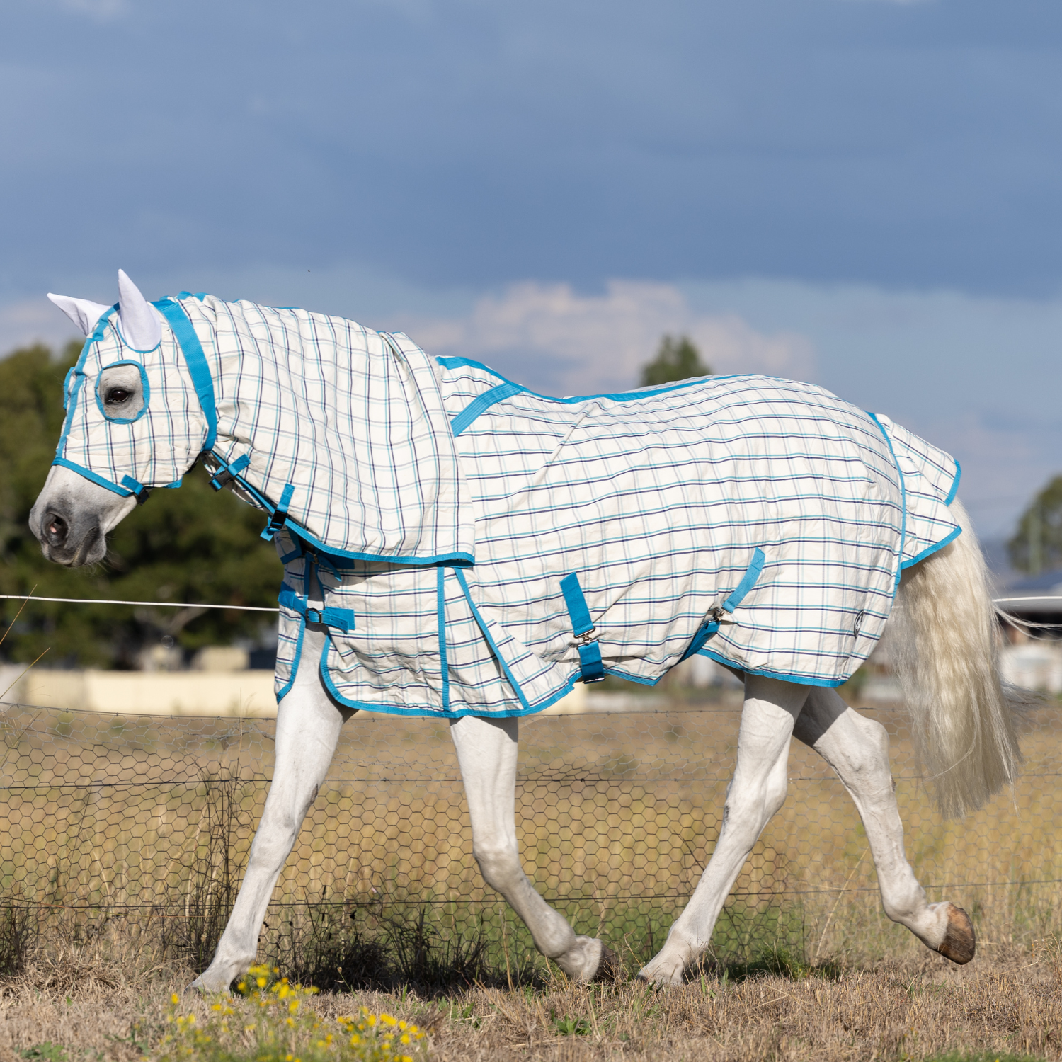 This hooded combo has well positioned eye holes, whether your horse's head is up or down. Flag fabric ears instead of ripstop provide extra breathability. There are 4 strong plastic clips that do up the head/neck piece for easy rugging, and a velcro safety strap for added security of the hood.
