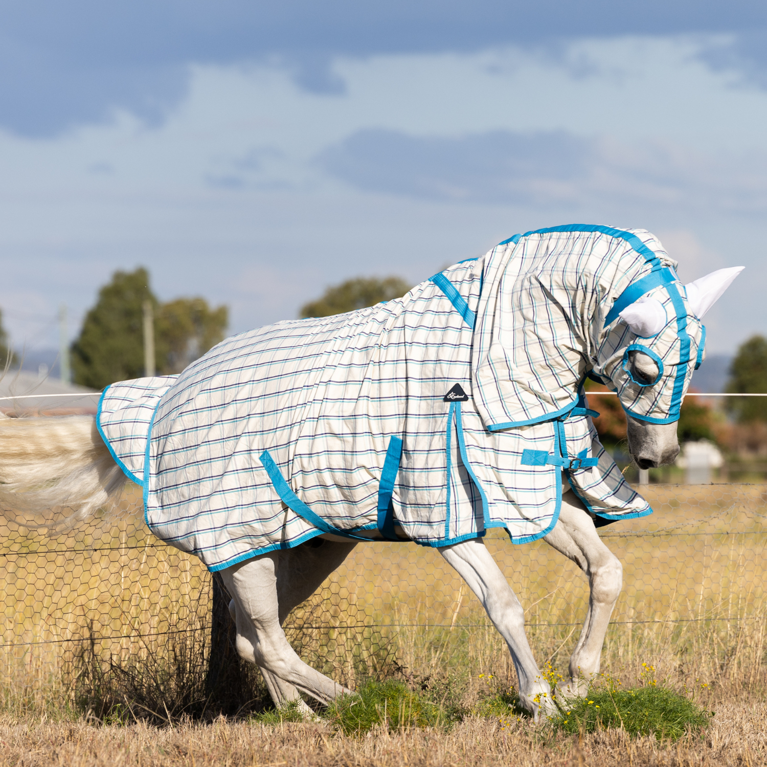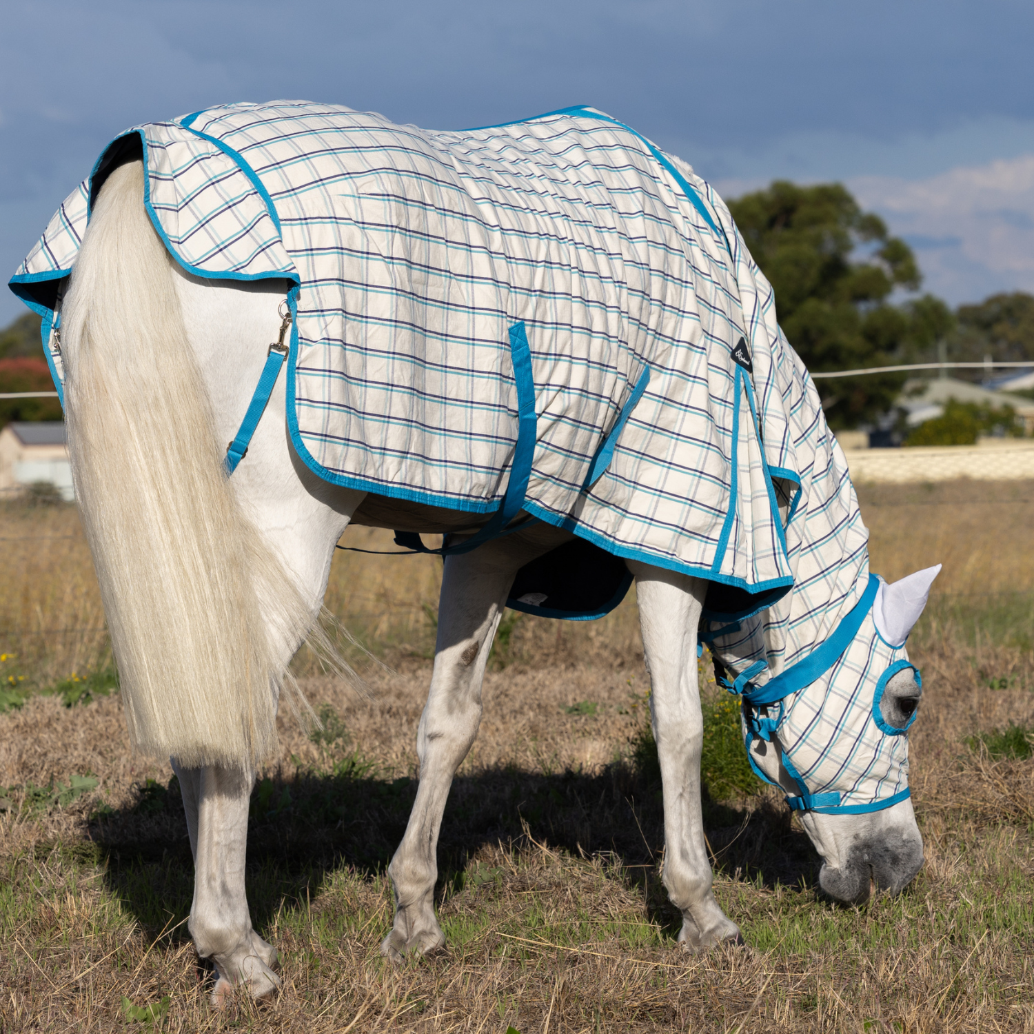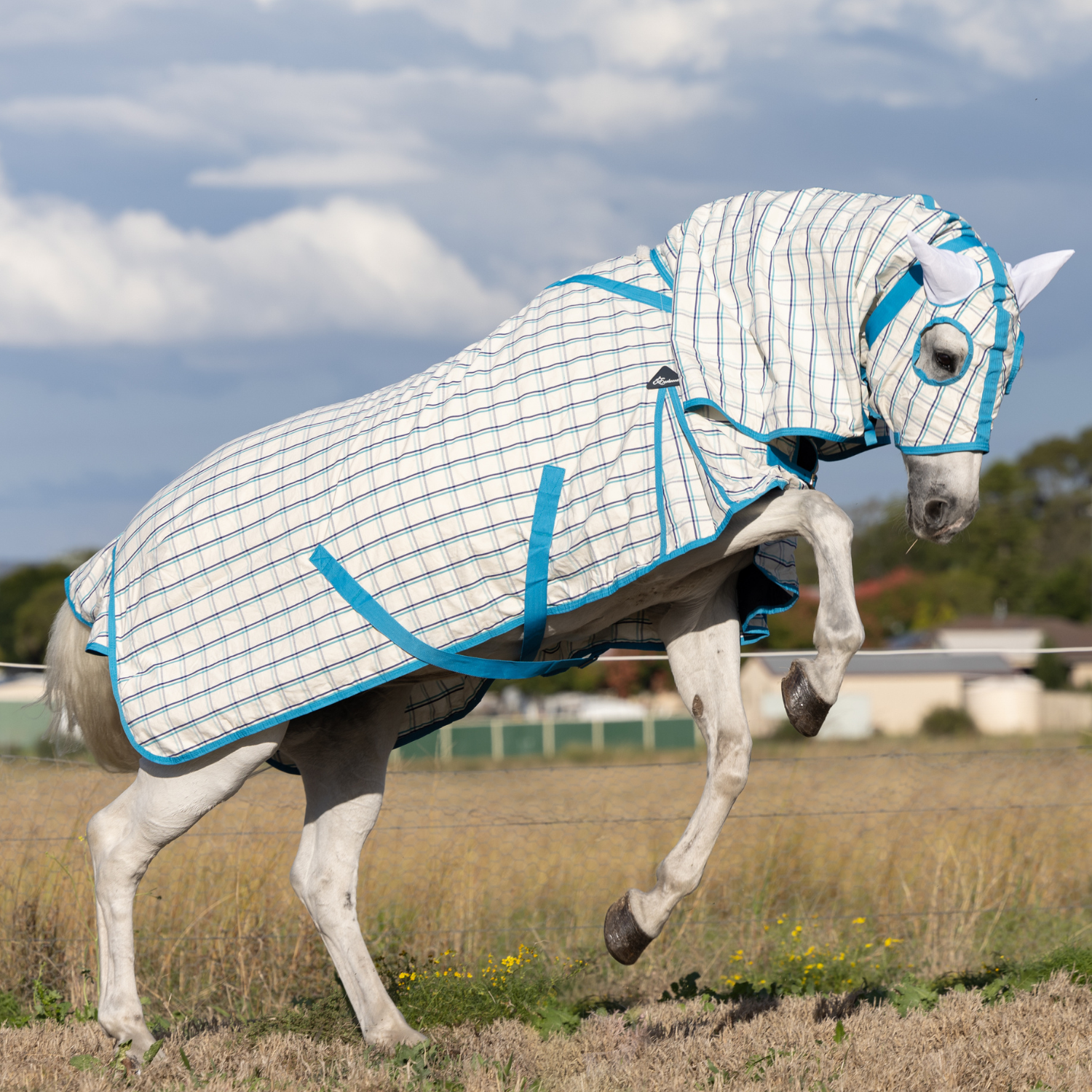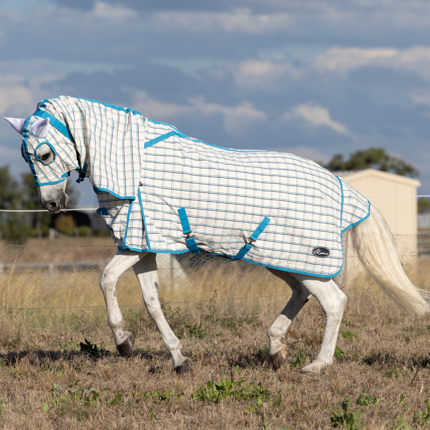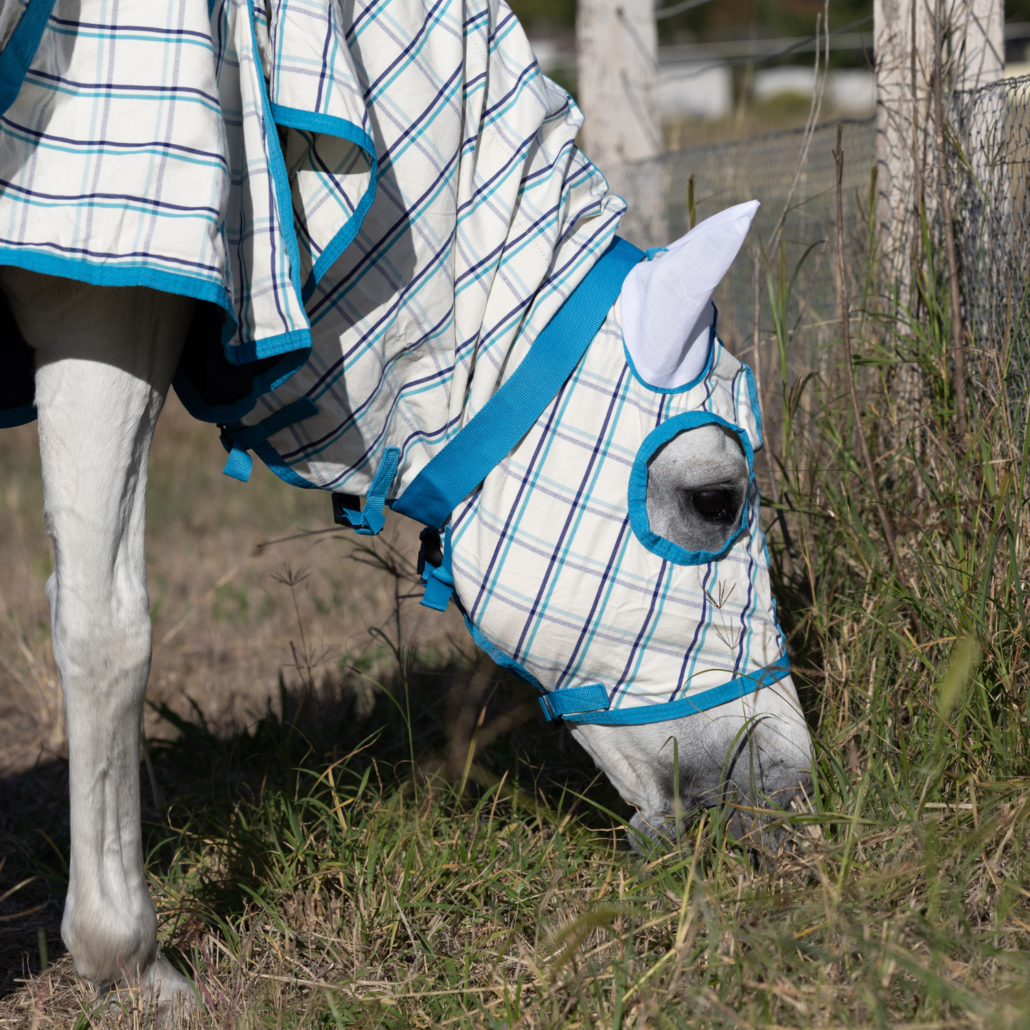 This hooded combo has well positioned eye holes, whether your horse's head is up or down. Flag fabric ears instead of ripstop provide extra breathability. There are 4 strong plastic clips that do up the head/neck piece for easy rugging, and a velcro safety strap for added security of the hood.