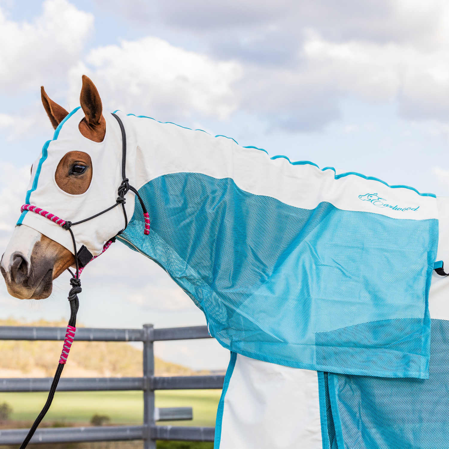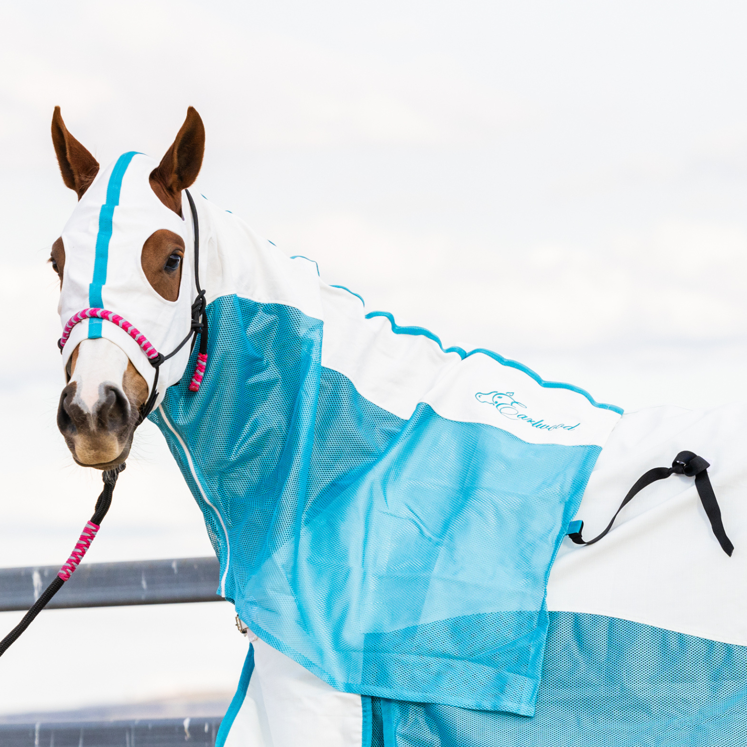 White 95% Cotton fabric hood, satin lined mane section, with bright turquoise mesh side panels.